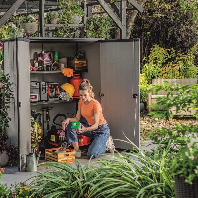 Dulapul Keter High Store Plus are rezistenta ridicata la intemperii si raze UV si imbina durabilitatea materialului cu aspectul rustic si textura din imitatie de lemn natural, astfel incat, peretii nu vor rugini si nu se vor deteriora, oferind o solutie de depozitare exterioara fara intretinere. In plus, acesta ofera o gama larga de posibilitati de personalizare, poate fi vopsit, iar in interior se pot monta rafturi si etajere, ce sporesc valorile functionale.