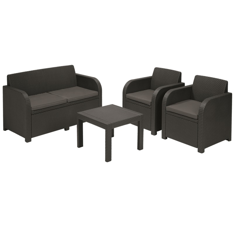 Setul Keter Georgia include doua fotolii si o canapea pentru doua persoane, piese comode cu brate usor rotunjite si o masuta patrata. Piesele sunt fabricate din polipropilena, care comparativ cu ratanul natural este mult mai rezistenta impotriva razelor UV si intemperiilor, precum ploaia, umiditatea sau zapada. Polipropilena nu necesita mentenanta, stratul de suprafata nu se exfoliaza, nu putrezeste si nu isi pierde culoarea in contact cu factorii externi. De asemenea, piesele de mobilier se pot curata usor, cu o laveta moale si cu apa.