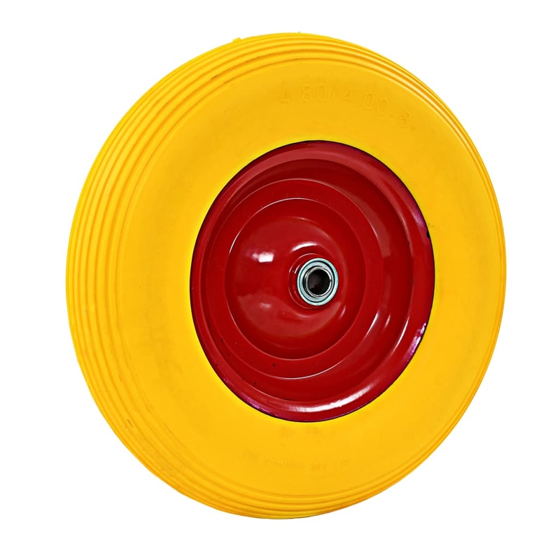 Anvelopa solida este fabricata din elastomer PU (poliuretan) durabil si rezistent la abraziune si are un design deosebit pe partea de rulare, care asigura un plus de aderenta la viteze mai mari. Janta este fabricata din metal robust. Roata de rezerva pentru carucior este de marime universala si poate fi montata cu usurinta la roabe, carucioare industriale, caruturi etc.